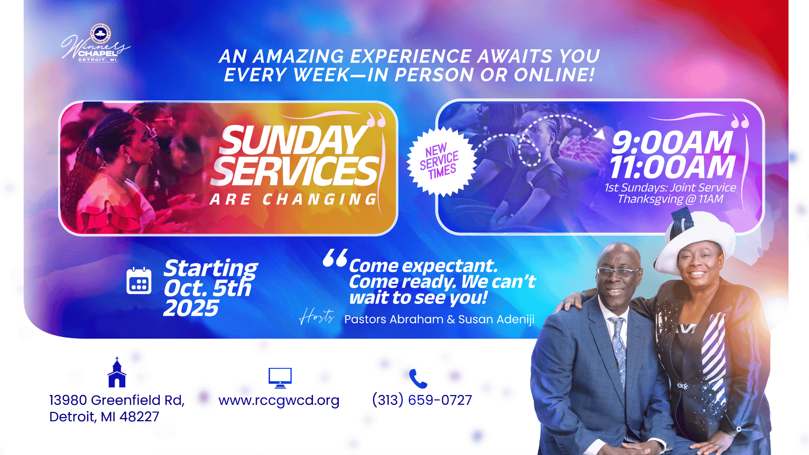 Get ready, RCCG Winners Chapel Detroit family and friends! We are thrilled to announce some exciting changes to our Sunday service schedule, designed to better serve our growing community and create an even more powerful worship experience.
